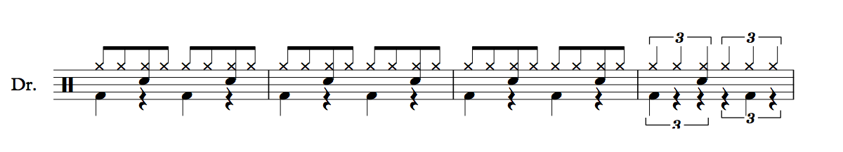 Next, we need to work on superimposing our original groove onto these 8th note triplets.  This groove is based on standard eighth notes and looks like this.