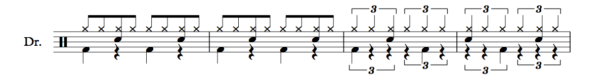 Next, we need to work on superimposing our original groove onto these 8th note triplets.  This groove is based on standard eighth notes and looks like this.